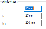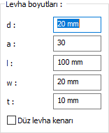 Levha boyutları ![]() Alın levhası değer girilerek belirlenir. Girilecek değerler şematik çizimde gösterilmektedir. |