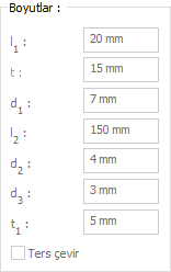 Boyutlar ![]() Levha boyutları değerler girilerek belirlenir. Girilecek değerler şematik çizimde gösterilmektedir. |