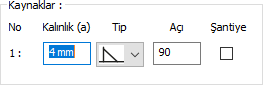 Kaynaklar ![]() Birleşim yerlerine yapılacak kaynakların kalınlık, tip ve açı değerleri verilir. Şantiyede yapılıp yapılmayacağı bilgisi girilir. |