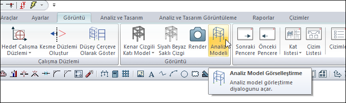 Ribbon menüde Görüntü sekmesi Görüntü başlığı altında bulunan Analiz Modeli ikonu tıklanarak analiz model görünümüne geçiş yapın.