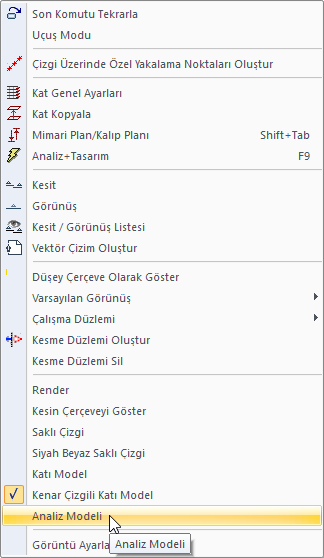 Ayrıca 3B görüntü üzerinde sağ tuş menüden de Analiz Modeli satırı tıklanarak aynı işlem yapılabilmektedir.