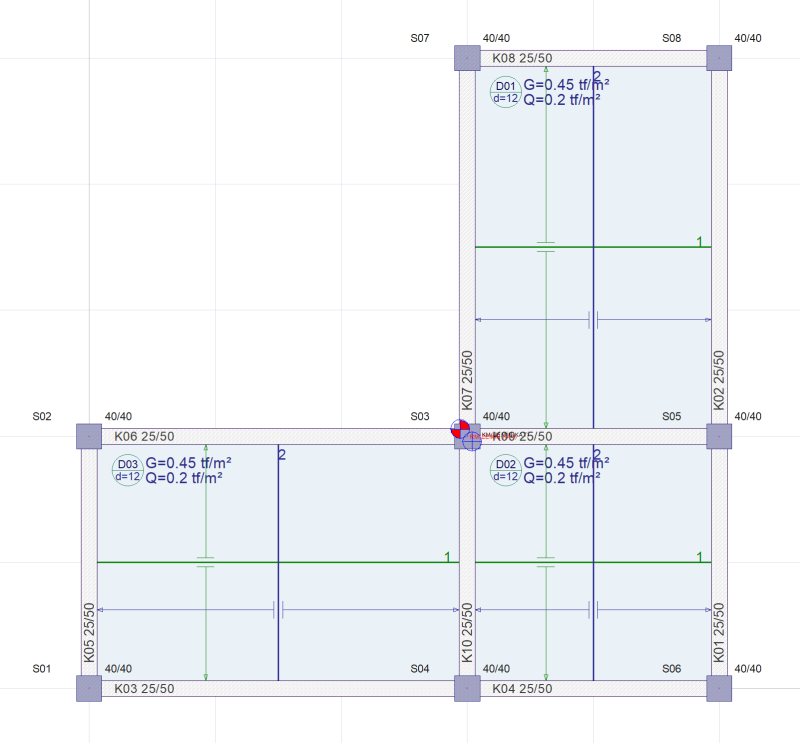 Plan görüntüsü aşağıdaki görselde verilen yapıda K06 kirişi için ani sehim hesabı yapılacak ve ideCAD sonuçları ile karşılaştırılacaktır. K06 kirişi için hareketli yükler (Q) etkisinde ani sehim hesabı ve sabit yükler (G) için ani sehim ve zamana bağlı sehim hesabı yapılacaktır. Sabit ve Hareketli yüklerden oluşan sehimlerden toplam sehim hesabı yapılarak sonuçlar ideCAD v10 ile karşılaştırılacaktır.