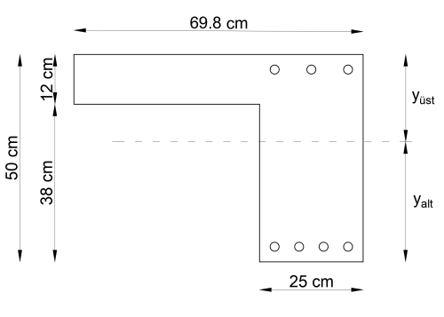 Tablalı kiriş kesitinin tüm atalet momenti Ic, değeri kesit ağırlık merkezine göre hesaplanmalıdır. Bu nedenle kesitin ağırlık merkezi ekseni, Kesit ağırlık merkezinin kesitin üstüne olan mesafesi, yüst ve Kesit ağırlık merkezinin kesitin altına olan mesafesi, yalt değerleri hesaplanmalıdır.
