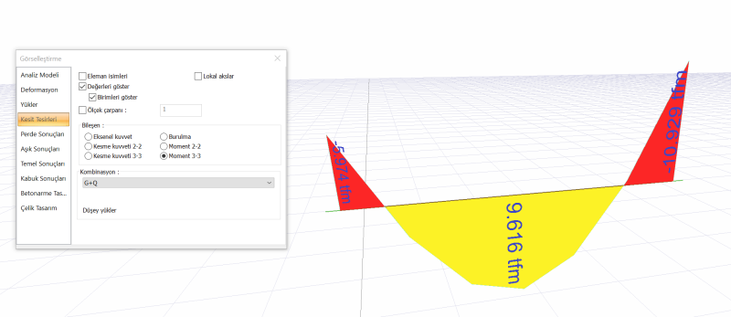 Bu örnekte sabit yük değerleri Örnek 1 'e göre artırılarak Eleman eğilme momenti değerinin Elemanın eğilme çatlama momenti değerinden büyük olması sağlanmıştır.
