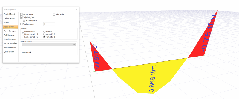 Örnek Projede K06 kirişinin Hareketli Yük (Q) etkisindeki moment diyagramı aşağıdaki görselde verilmiştir.