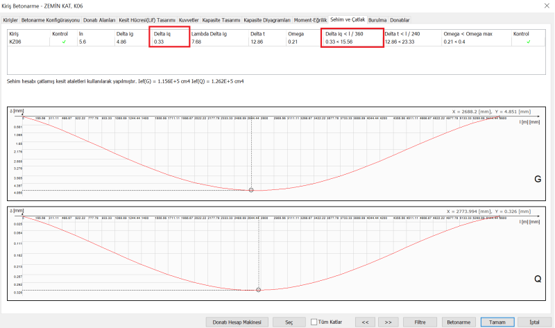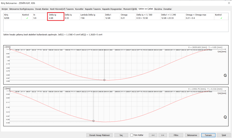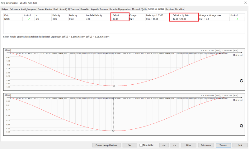 Kiriş Betonarme penceresinde K06 kirişinin Sabit ve Hareketli yükler etkisindeki toplam sehim sonuçları aşağıda gösterilmiştir.