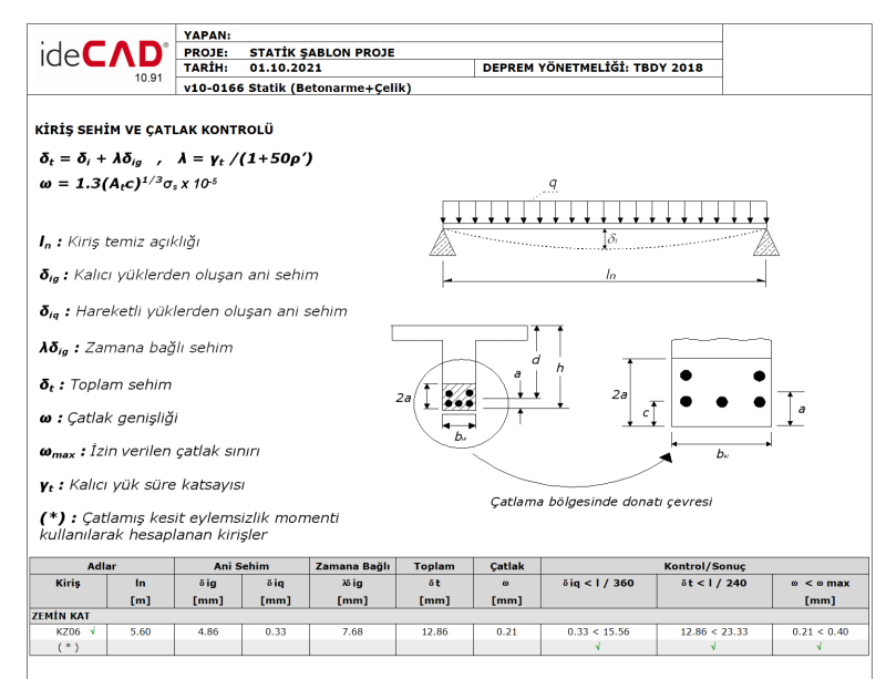 Kiriş Sehim ve Çatlak Kontrolü Raporu 'nda da yukarıda hesaplanan sonuçlar kontrol edilebilir.