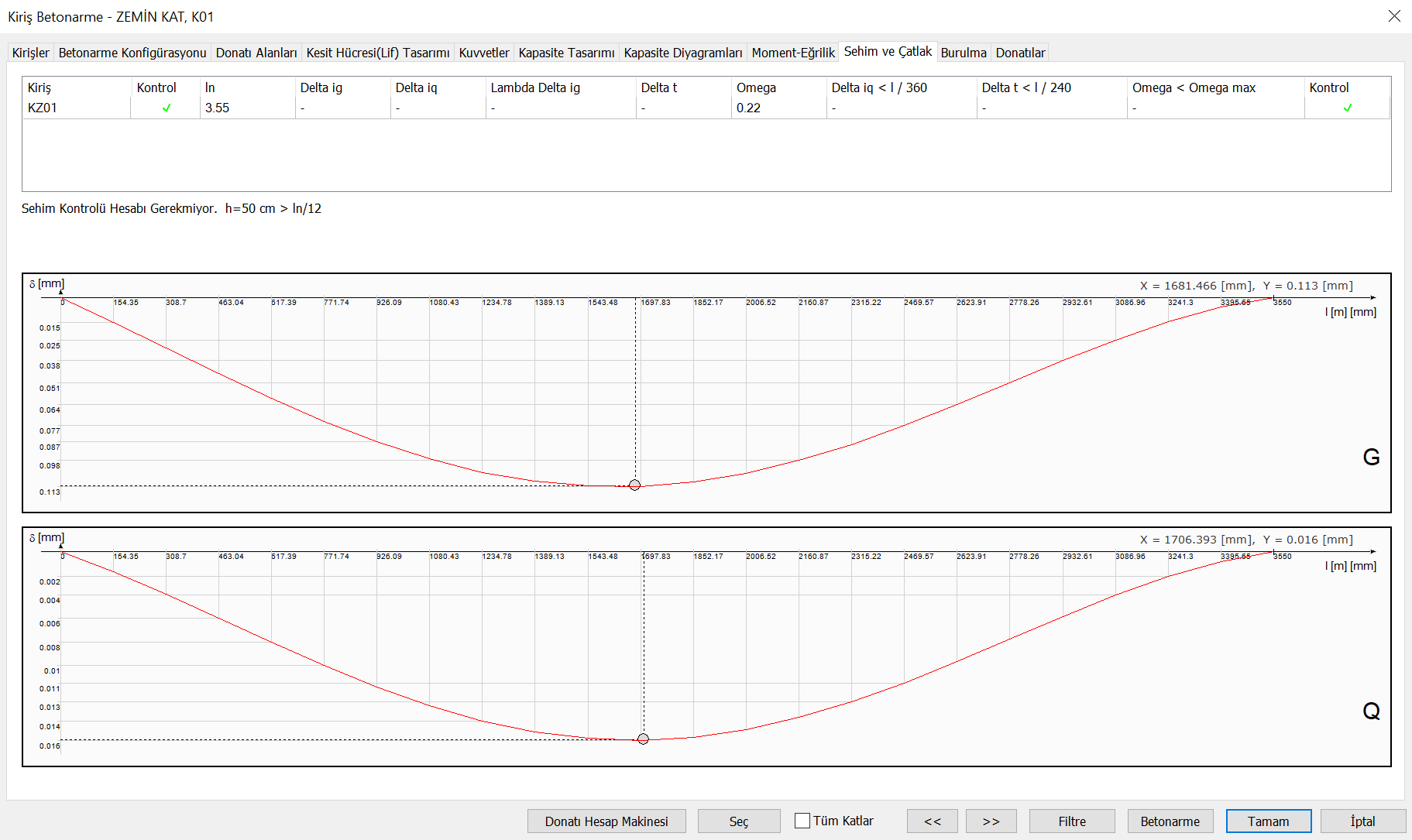 Betonarme kirişler ve döşemelerde TS 500 'de belirtilen sehim kontrolü, çatlak kontrolü otomatik yapılır. Ani sehim hesabı ve zamana bağlı sehim hesabı TS 500 'de belirtilen koşullara uygun olarak kontrol edilir.