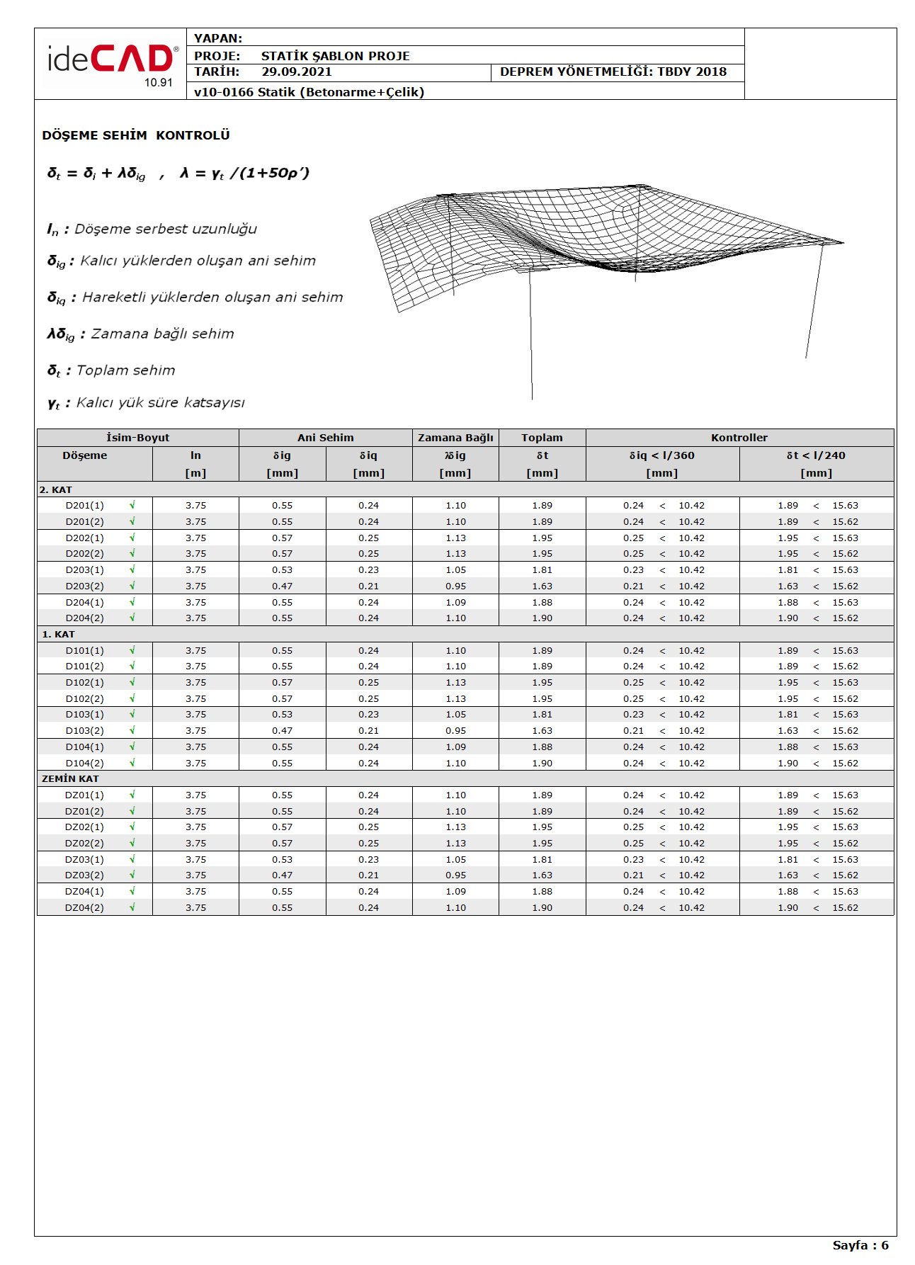 Döşeme Sehim Kontrolü raporundan döşemelerde hesaplanan ani sehim ve zamana bağlı sehim sonuçları incelenebilir.