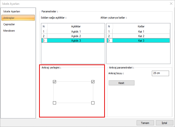 Ankraj Yerleşim ayarı ile iskelelerde ankraj yerleri belirlenir. Ankraj yerleşim ayarına, iskele ayarları diyaloğu ankrajlar sekmesinden ulaşılır.