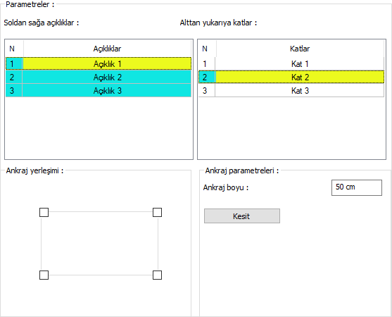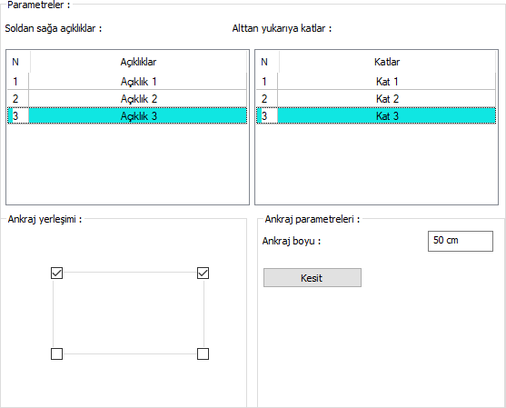 Ankraj ayarları iskele içerisindeki bütün açıklıklar için ayrı ayrı yapılabilir. Alttan yukarıya katlar bölümünden kat seçimi yapabilirsiniz. Soldan sağa açıklıklar bölümünden seçili katlarda yer alan açıklıkları seçebilirsiniz. Ctrl tuşuna basılı tutarak seçim yaparsanız çoklu seçim yapabilirsiniz.