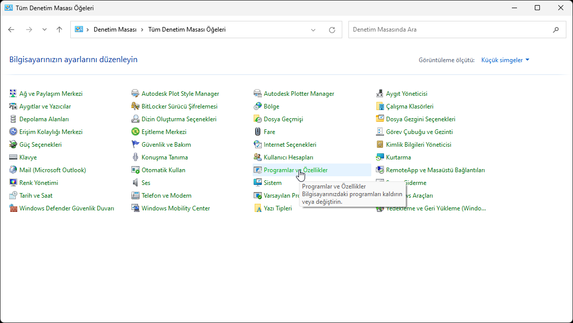 Denetim Masası diyaloğundan Programlar ve Özellikleri satırını tıklayın.