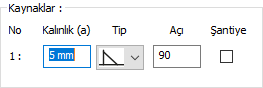 Kaynaklar ![]() Birleşim yerlerine yapılacak kaynakların kalınlık, tip ve açı değerleri verilir. Şantiyede yapılıp yapılmayacağı bilgisi girilir. |