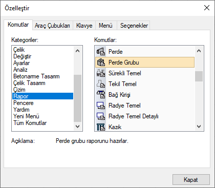 Açılan diyalogda Kategoriler kısmından istediğiniz komuta ulaşınız. Örneğin Kategoriler bölümünden Rapor'u seçiniz.