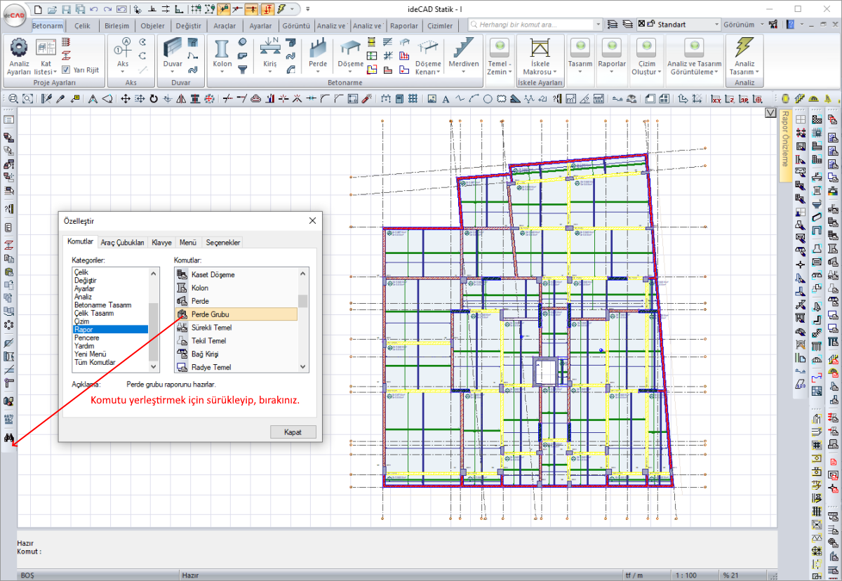 Komutlar bölümünden örneğin Perde Grubu satırını seçiniz, farenin sol tuşuna basılı tutarak, istediğiniz araç çubuğuna sürükleyip, bırakınız.