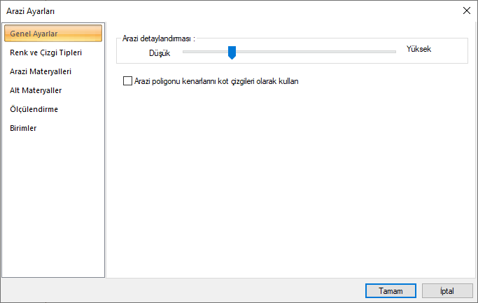 Arazi Ayarları komutuyla arazi detaylandırma, arazi çizim ve materyal seçimi gibi ayarlarına ulaşılır.