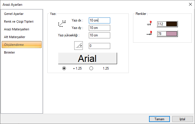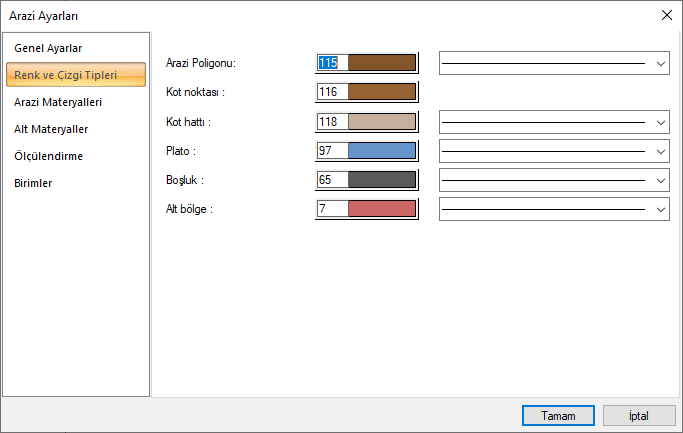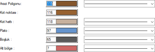 Renkler ve çizgi tipleri ![]() Sırasıyla arazi poligonu, kot noktası, kot hattı, Plato, Boşluk ve Alt Bölge elemanlarının renk ve çizgi tipleri listeye tıklayarak belirleyebilirsiniz. |
