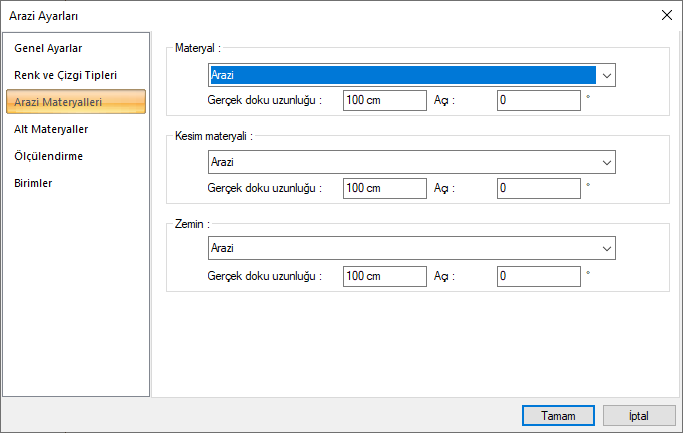 Materyal ![]() Arazi üst materyalini tıklayarak listeden seçebilirsiniz. |
