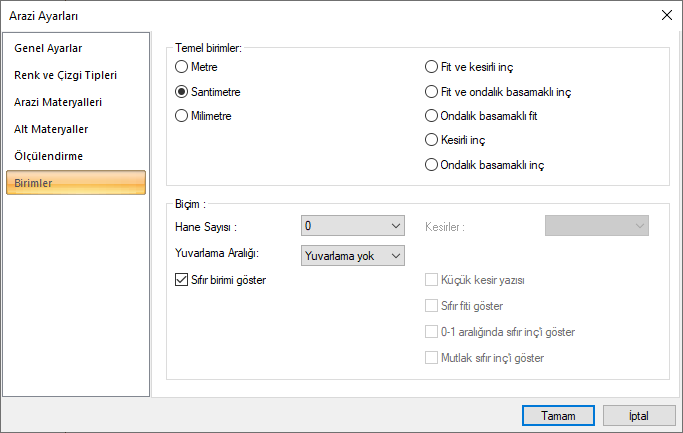 Temel birimler ![]() Seçimlerden biri farenin sol tuşu işe tıklanarak etkin hale getirilir. Metre: İşaretlenirse, bilgi yazısının birimi metre olur. |