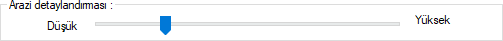 Arazi detaylandırması ![]() Arazinin detay düzeyini belirleyen göstergedir. Soldan sağa doğru çekilen ibre ile daha detaylı bir arazi çizimi oluşturulur. İbreyi, bilgisayarınızın donanım gücüne göre en optimum performans verecek bir düzeye getirebilirsiniz. |
