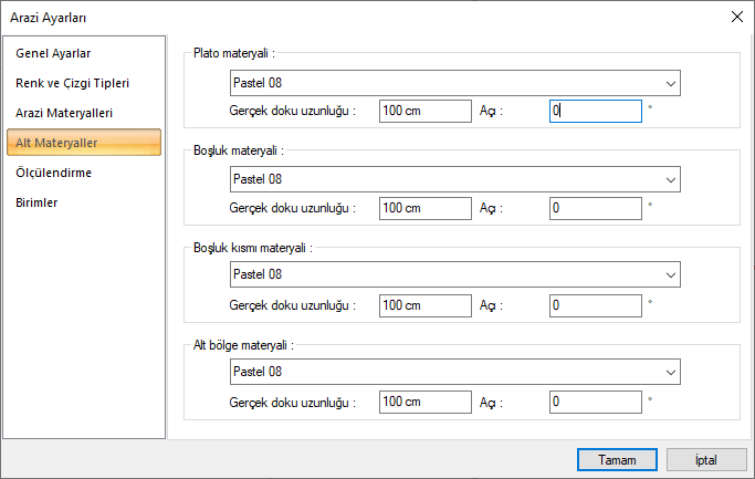 Alt bölge materyali ![]() Alt bölge yüzeylerinin materyalini tıklayarak listeden seçebilirsiniz. |