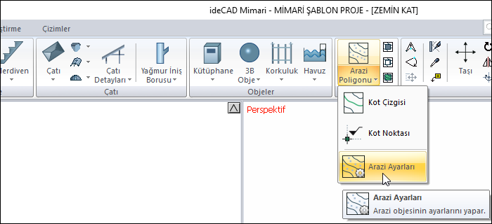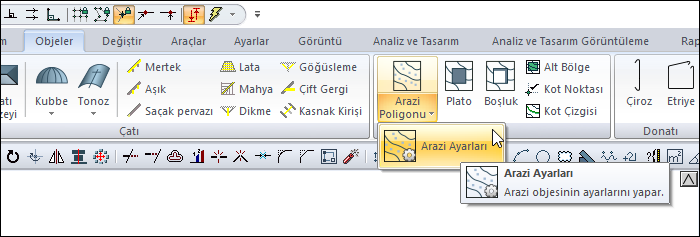 Mimari programda ribbon menü Giriş sekmesi Arazi başlığı altından ulaşabilirsiniz.