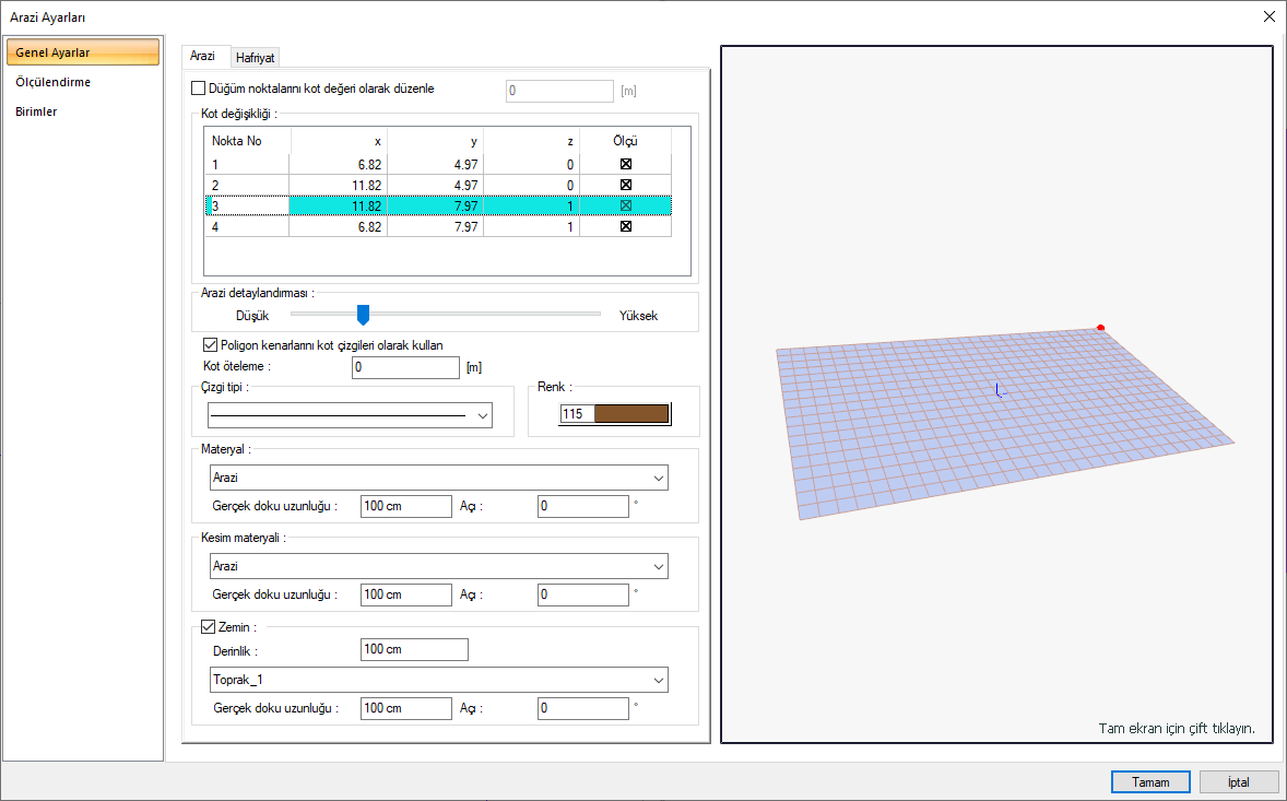 Zemin özelliğinin işaretlenmesi ve derinlik değeri olarak 100 cm verilmesi ![]() |