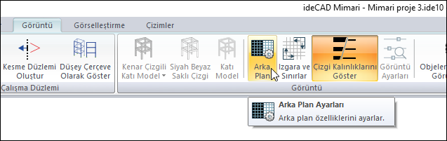 2 boyutlu ve 3 boyutlu sayfaların arka plan renkleri, seçilmiş obje rengi arkaplan ayarlarından değiştirilir. Arka plan ayarlarına Arka Plan komutundan ulaşılır.