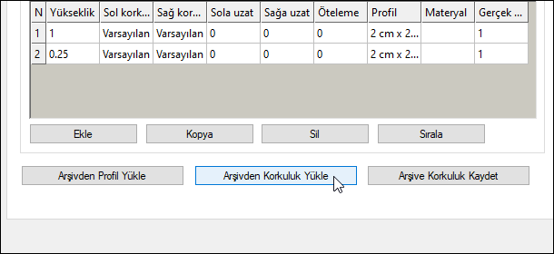 Arşivden Korkuluk Yükle komutuna Korkuluk Ayarları diyaloğundan ulaşabilirsiniz.