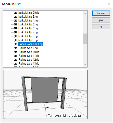 Korkuluk Arşiv diyaloğundan bir korkuluk seçilmesi tamam butonlarına tıklanarak yükleme işleminin tamamlanması ![]() |