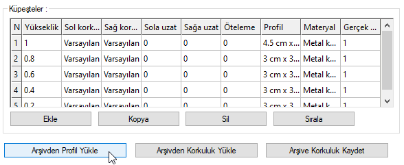 Korkuluk, küpeşte, dikme veya perdelerin kesitlerinde kullanılmak üzere, daha önceden hazırlanıp arşive kaydedilmiş profiller, Korkuluk Ayarları diyaloğunda Arşivden Profil Yükle butonu ile seçilip kullanılır.