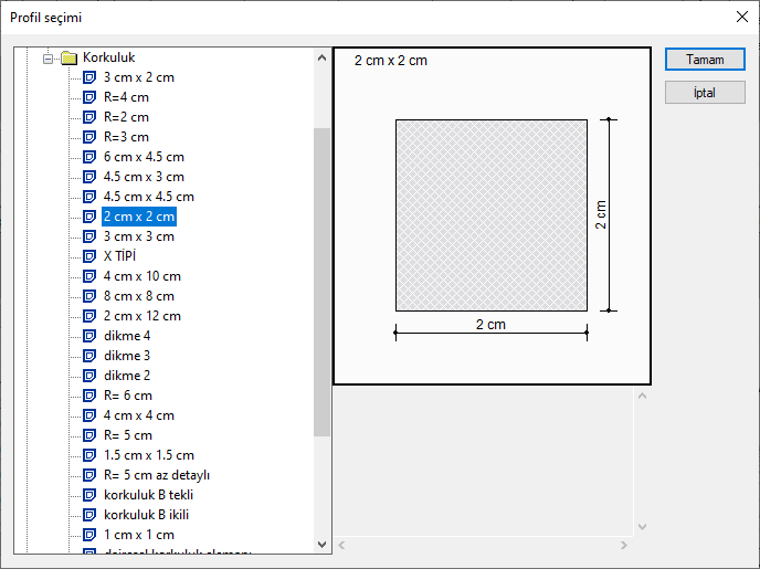 Bu diyalogda klasörler halinde profiller yer almaktadır. Korkuluk klasörü altında bulunan profillerden birini (Örneğin 2 cm x 2 cm) seçin.