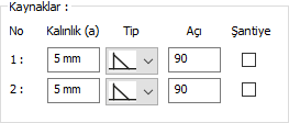 Kaynaklar ![]() Birleşim yerlerine yapılacak kaynakların kalınlık, tip ve açı değerleri verilir. Şantiyede yapılıp yapılmayacağı bilgisi girilir. |