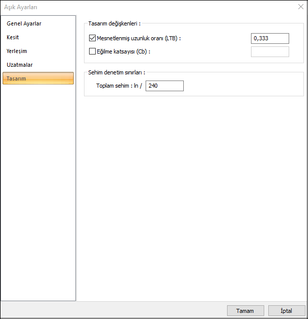 Sehim sınırı | Tasarımda kullanılan ilgili Çelik Yapılar yönetmeliğinde belirtilen eleman bazlı sınır değerdir. Aşığın kullanıldığı durumlara göre sınır değerinin kullanıcı tarafından değiştirilmesi gerekmektedir. |