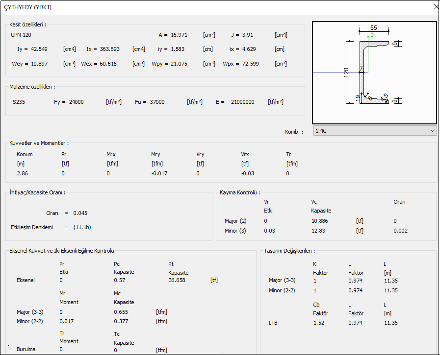Eğilme katsayısı (Cb) | Moment düzeltme katsayısı, Çelik Yapılar Yönetmeliği Denklem 9.1' e göre hesaplanır. |