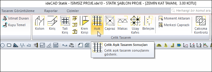 Analiz yapıldıktan sonra, ribbon menü Analiz ve Tasarım sekmesi Çelik Tasarım başlığı altından Aşık komutuna tıklayarak ulaşabilirsiniz.