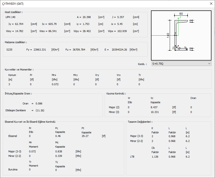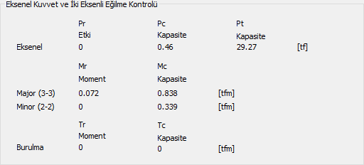 Eksenel kuvvet ve iki eksenli eğilme kontrolü ![]() Aşığın eksenel kapasite ve moment kapasitesi oranları gösterilir. |