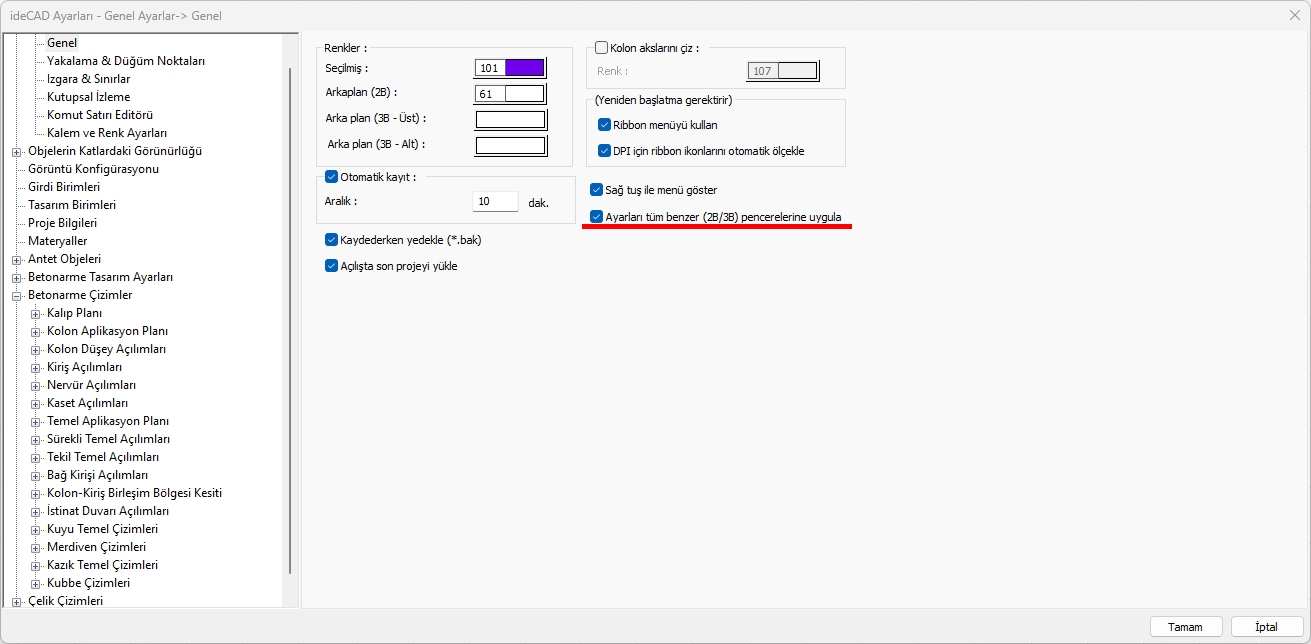 Genel Ayarlar diyaloğu Genel Ayarlar sekmesinden Ayarları tüm benzer (2B/3B) pencerelerine uygula özelliğine ulaşabilirsiniz.