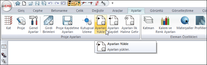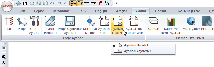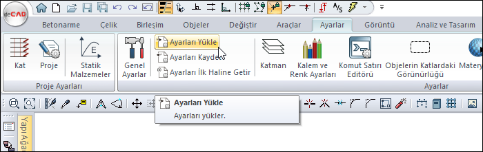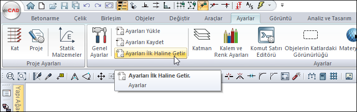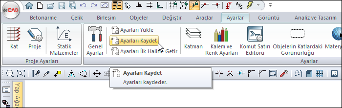 Ayarları kaydet, yükle ve ilk haline getir komutlarıyla çizim ve obje ayarları .set uzantılı dosya olarak kaydedilebilir, başka projelerde o ayarlar yüklenebilir ya da yapılan ayarlar sıfırlanarak ilk haline getirilebilir.