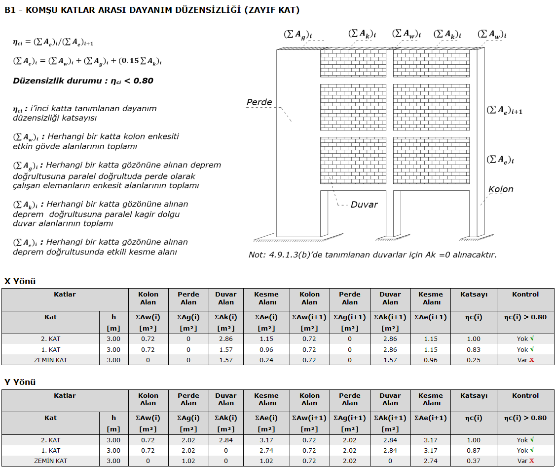 B1 - Komşu Katlar Arası Dayanm Düzensizliği (Zayıf Kat), bir kattaki etkili kesme alanının, bir üst katla kıyaslandığında, yönetmelikte belirtilen değerden az olması durumunda ortaya çıkar. Kesme alanındaki değişkenler perde, kolon ve duvarlardır(nci). Etkili kesme alanları ideCAD’de girilen taşıyı sistem ve duvar-duvar yüklerine göre otomatik hesaplanmakta ve değerler deprem yönetmeliği genel raporunda basılmaktadır.