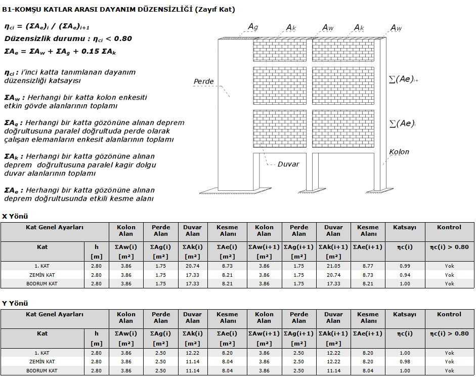 B1 (Zayıf Kat) Düzensizliği bir kattaki etkili kesme alanının, bir üst katla kıyaslandığında yönetmelikte belirtilen değerden az olması durumunda ortaya çıkar. (nci<0.80)