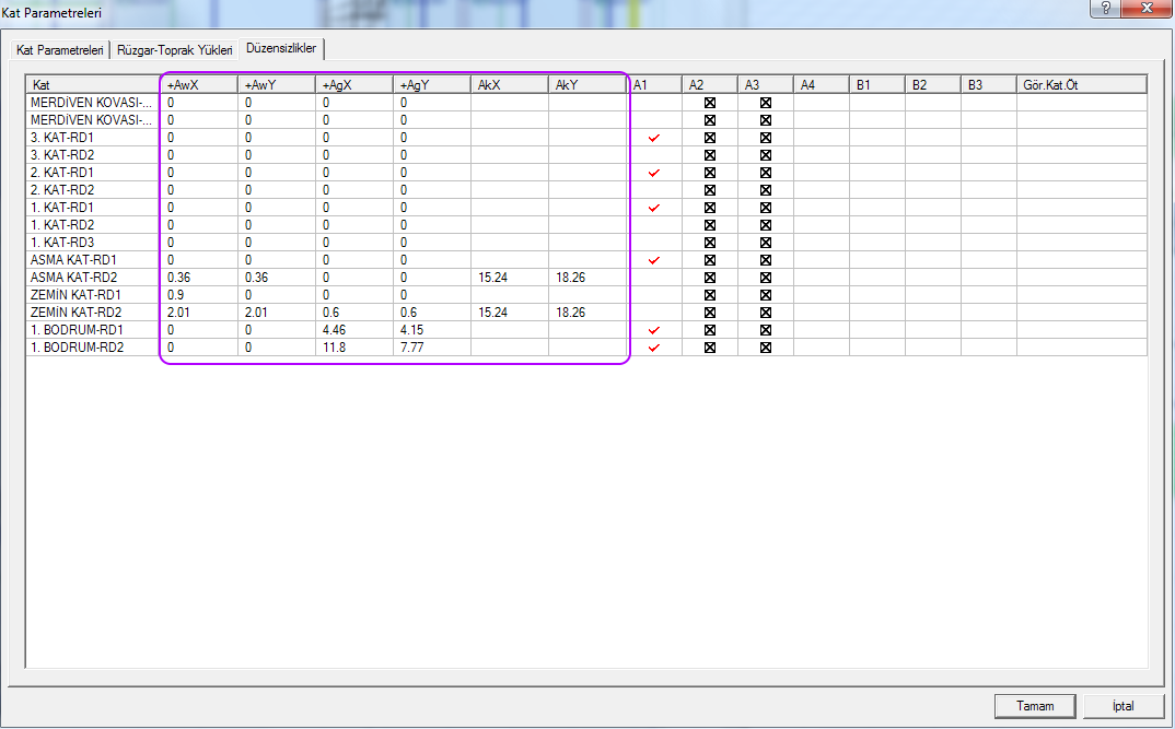 Kat Parametreleri diyalogu Düzensizlikler sekmesinde müdahale edilebilmektedir.