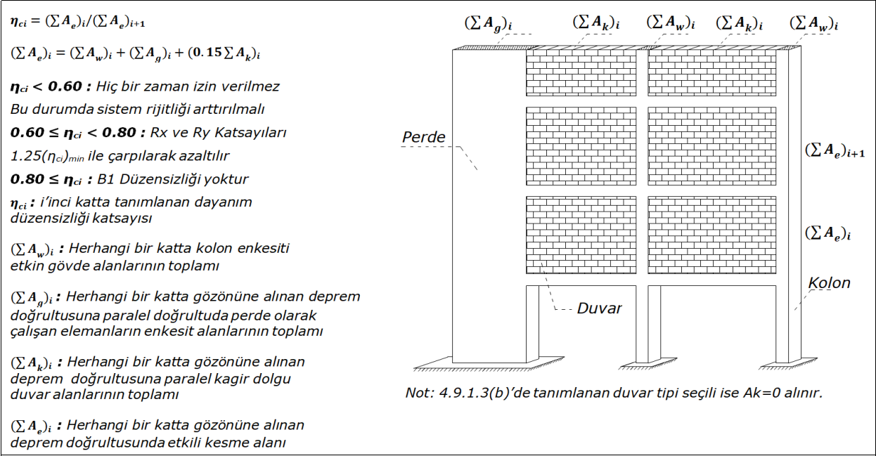 B1 komşu katlar arası dayanım düzensizliği betonarme binalarda, birbirine dik iki deprem doğrultusunun herhangi birinde, herhangi bir kattaki toplam etkili kesme alanı’nın, bir üst kattaki toplam etkili kesme alanı’na oranı olarak tanımlanan Dayanım Düzensizliği Katsayısı ηci ’nin 0.80’den küçük olması durumudur. Dayanım Düzensizliği Katsayısı ηci aşağıdaki gibi tanımlanır.