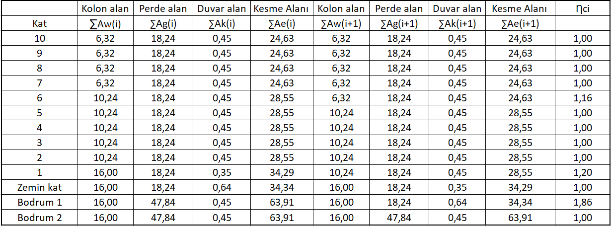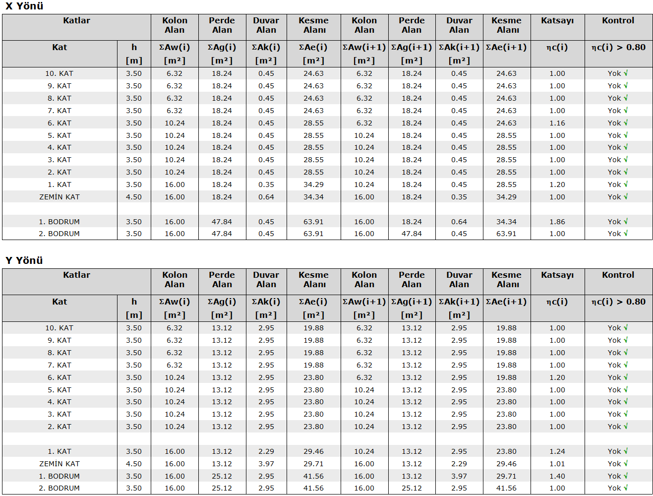 Bu hesap elle kontrol edilmek istenirse öncelikle her bir katta kolon, perde ve duvar alanlarının tespit edilmesi gerekir. X yönü için birer örnek ile detaylandırılacak olursa;