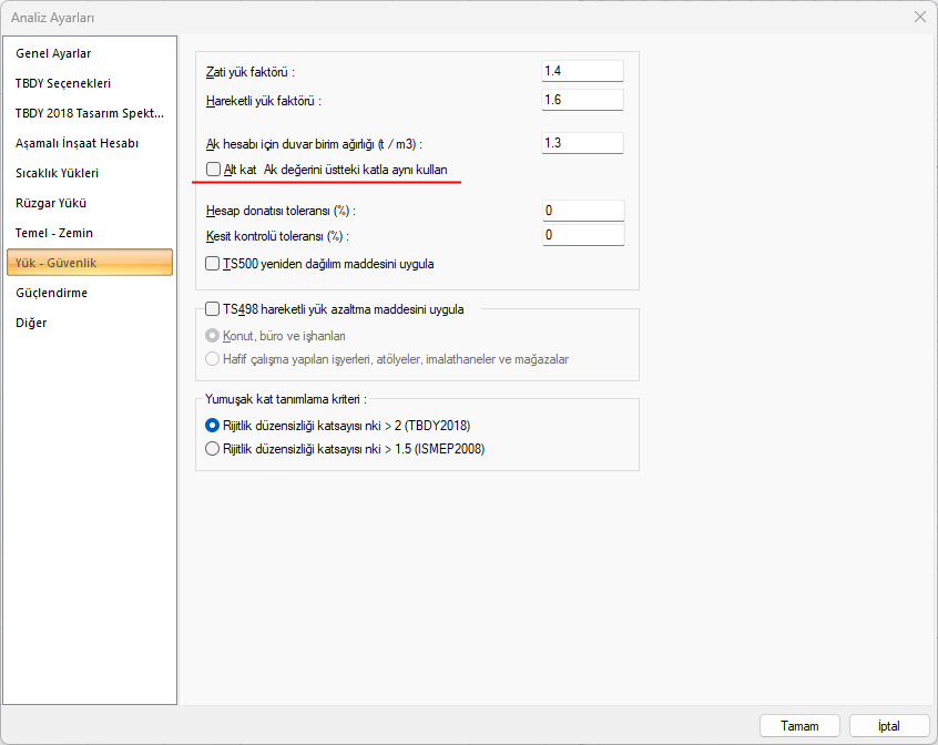 Analiz parametrelerin bulunan Alt kat Ak değerini üstteki katla aynı kullan seçeneği Ak hesabı için önemlidir.