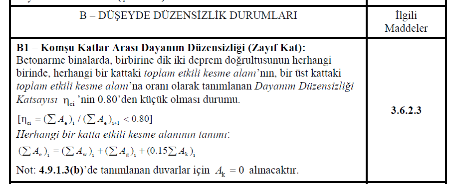 B1 Komşu katlar arası dayanım düzensizliği Betonarme binalarda, birbirine dik iki deprem doğrultusunun herhangi birinde, herhangi bir kattaki toplam etkili kesme alanı ’nın, bir üst kattaki toplam etkili kesme alanı’na oranı olarak tanımlanan Dayanım Düzensizliği Katsayısı ηci ’nin 0.80’den küçük olması durumudur