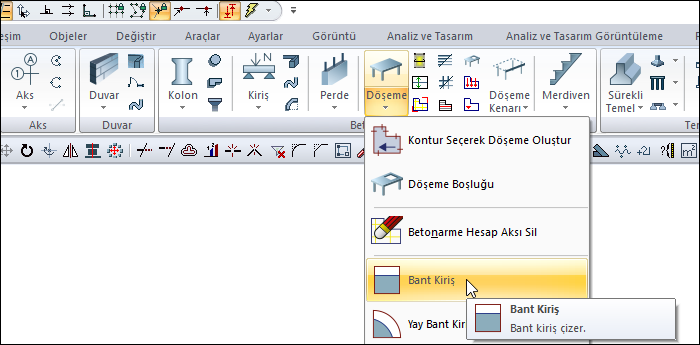 Bant kiriş komutu ile tünel kalıp projelerinde boşta kalan perde uçlarında konstrüktif kirişler oluşturulur. Bant kirişler analizde kullanılmazlar.