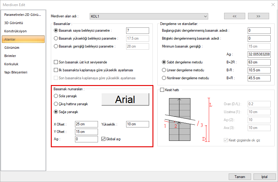 Basamak numaraları ayarlarıyla, basamak numaraları merdivende istenilen yere yerleştirilir. Bu ayar her merdiven alanı için ayrı ayrı yapılır.