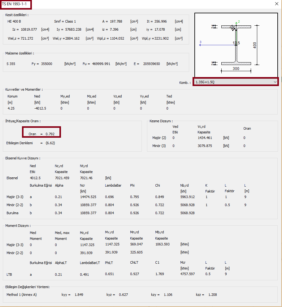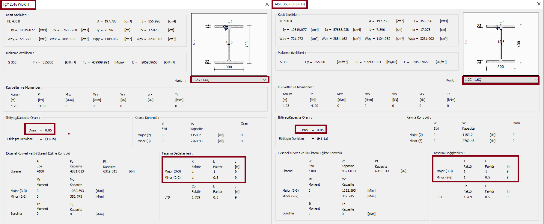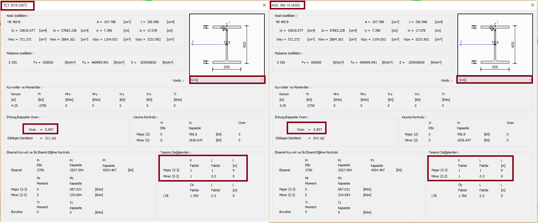 Yerel burkulma ve eğilmeli burkulma formülleri ve güvenlik katsayılarının aynı olması sebebi ile sonuçlarda LRFD = YDKT; ASD = GKT ‘dir.