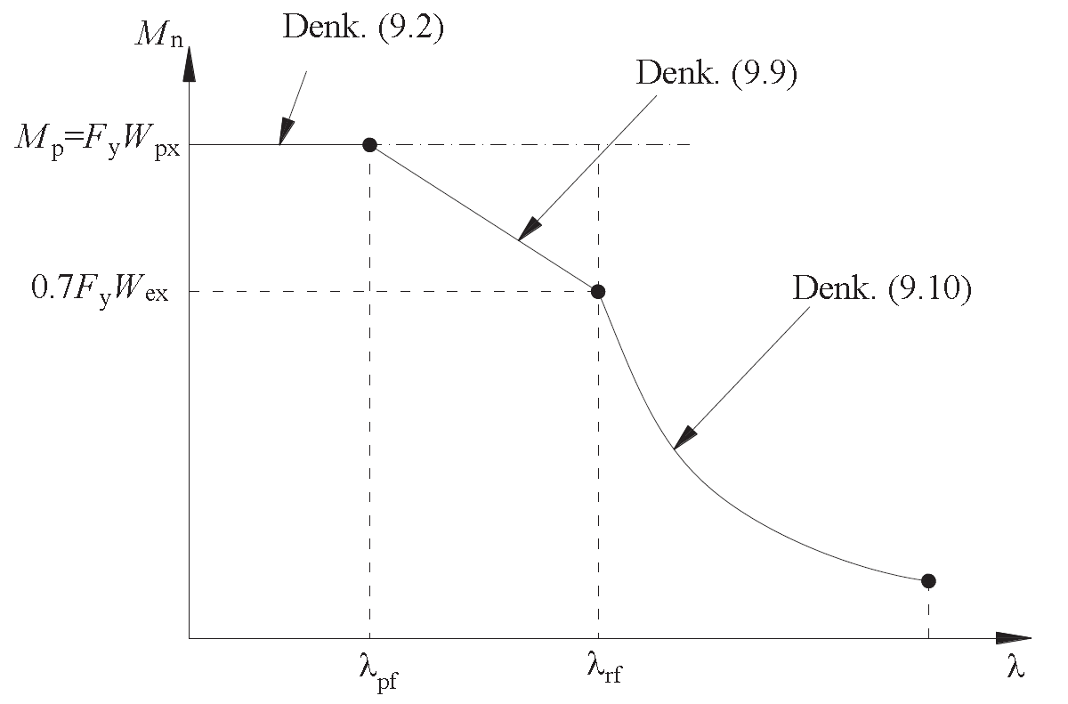 Kuvvetli eksen etrafında eğilme etikisindeki çift simetri eksenli I-enkesitli elemanlar için yerel burkulma sınır durumunda, karakteristik eğilme momenti dayanımı, Mn ‘nin, enkesitin başlık parçası narinliği λf e bağlı olarak değişimi;